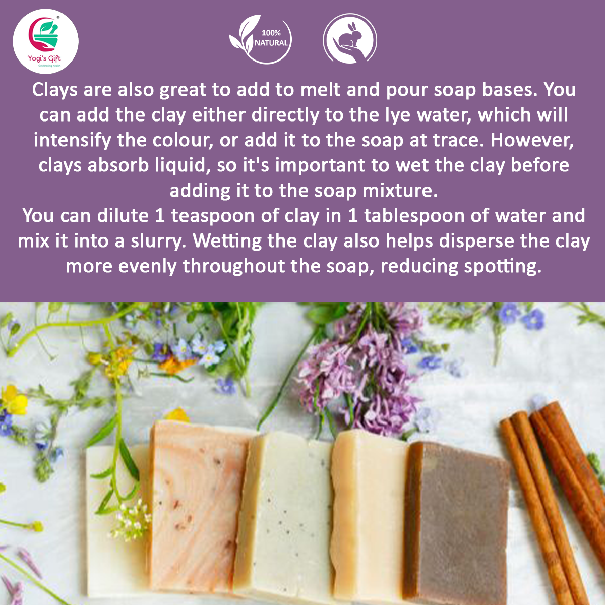 - ★ 𝐂𝐥𝐚𝐲 𝐟𝐨𝐫 𝐬𝐨𝐚𝐩 𝐦𝐚𝐤𝐢𝐧𝐠 : Purple is one of the elegant clays that adds a wonderful color and texture to your homemade soap. Rhassoul clays bring a red tone. You can add yellow clay to make it lighter. Experience the joy of making colourful soaps at home with this pack.