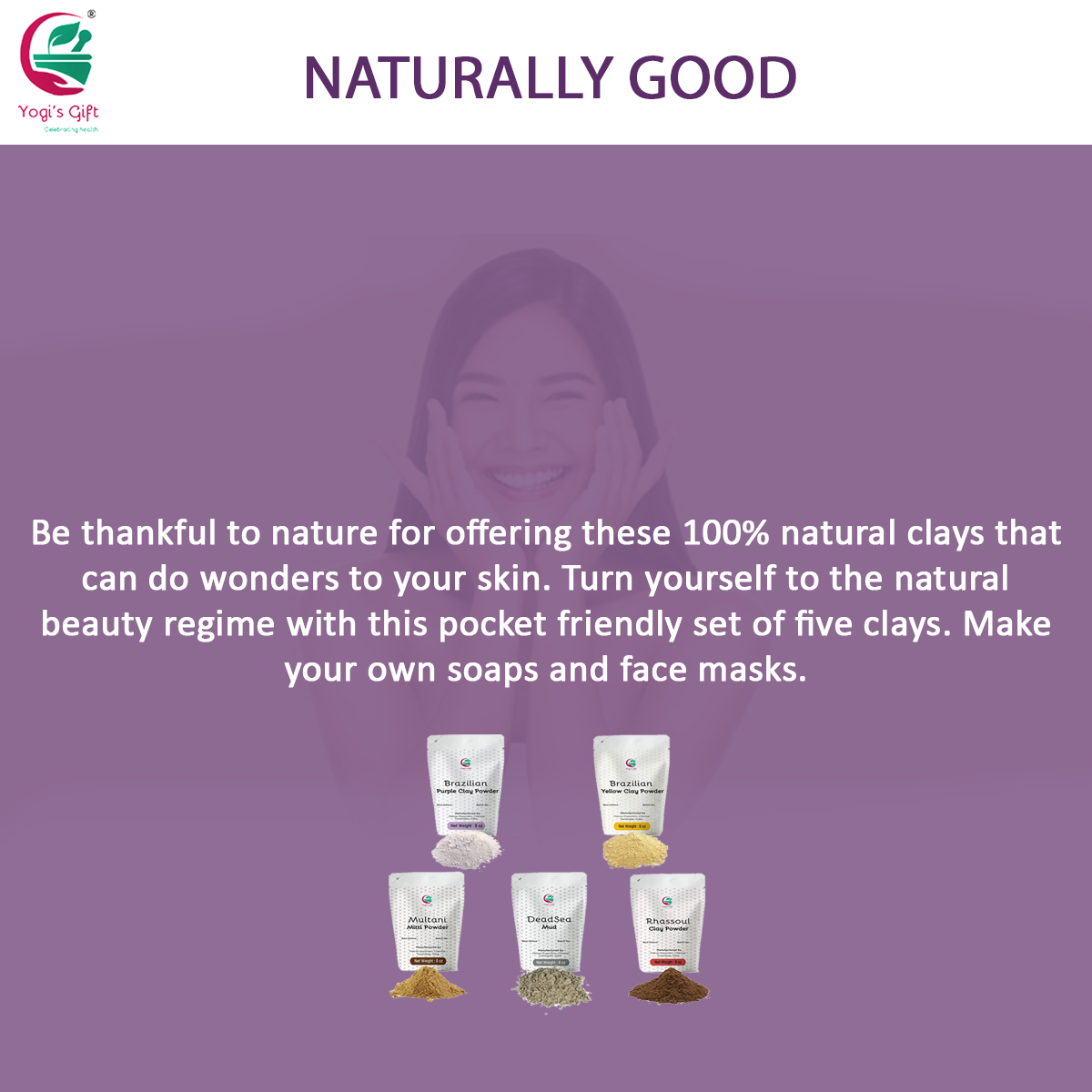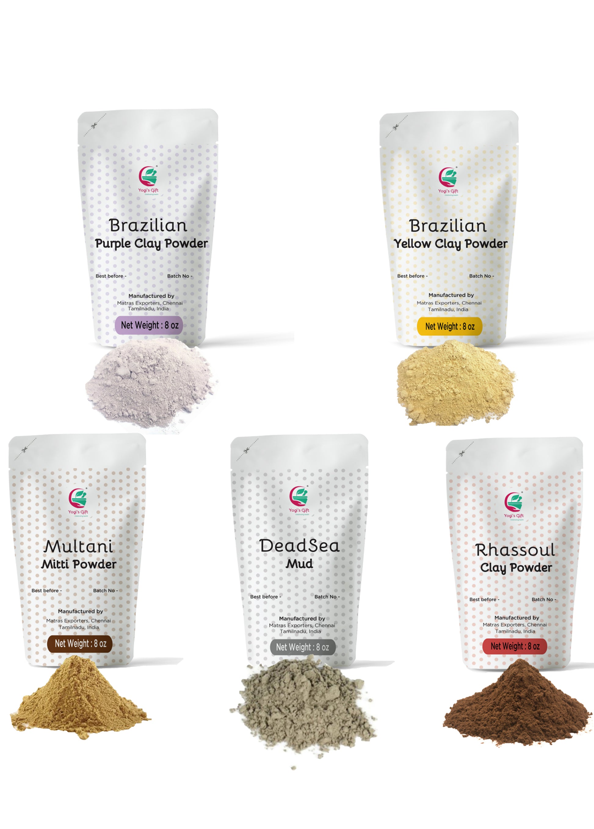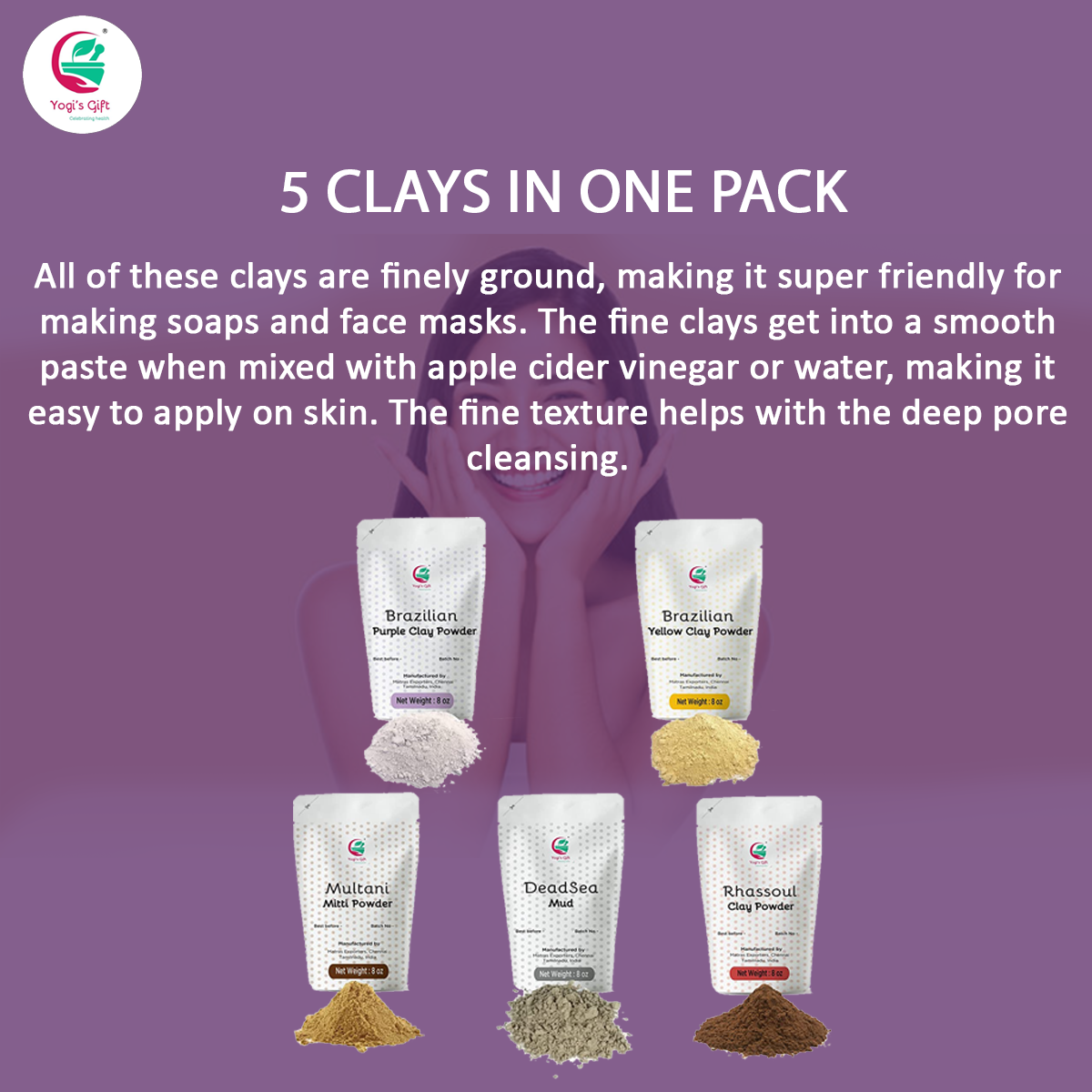 Five Natural Clays | Soap Making Clay | Face Mask Ingredient | Purple clay, Yellow clay, Multani Mitti, Dead Sea Mud & Rhassoul Clays | 8oz each | Best Value Pack of Colourful Clays | by Yogi’s Gift®
